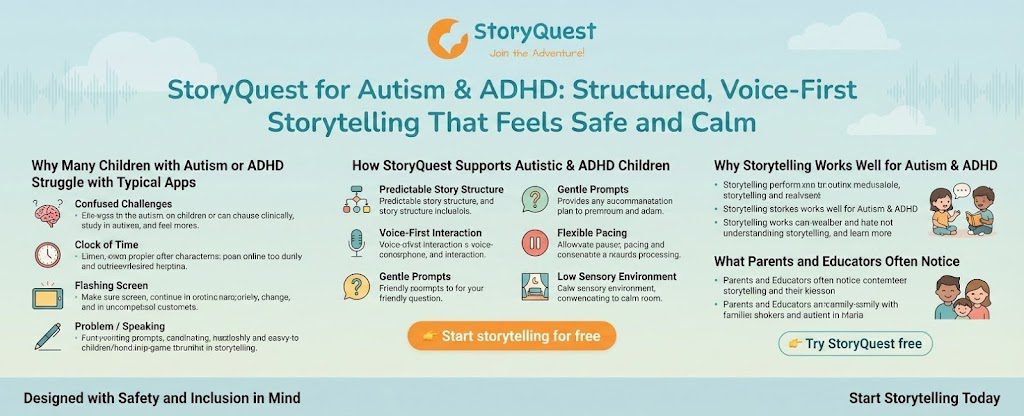 StoryQuest is a voice-first storytelling platform designed to support children with autism and ADHD through gentle structure, predictable flow, and low sensory load.