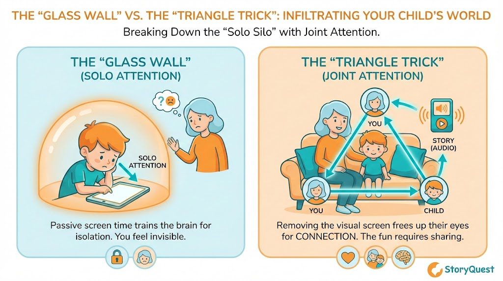 Most screen time today creates Solo Attention. The child’s brain is locked in a direct line with the device. The rest of the world (including you) fades into background static.